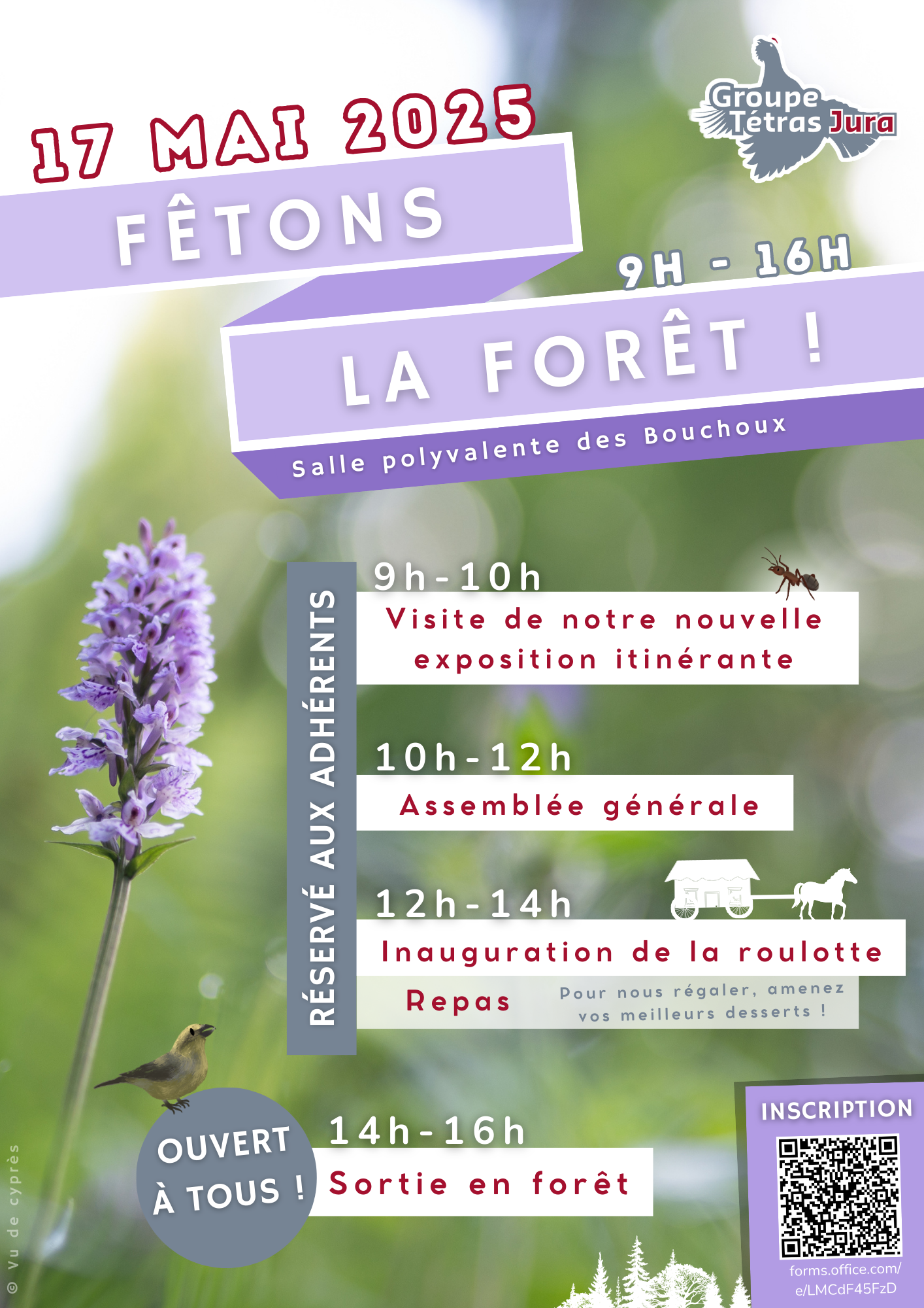 • 12h30-14h : repas fourni par le Groupe Tétras Jura. Faites nous goûter vos meilleurs desserts !