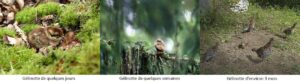 - place de poudrage : en période sèche, la Gélinotte des bois prend des bains de poussière. Dans du sable ou de la terre, au pied d’un épicéa ou derrière un rocher, cette activité a une fonction antiparasitaire et d’entretient du plumage. En fonction de la température, cette activité peut durer plusieurs dizaines de minutes.