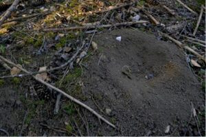 - igloo nocturne (amas important de crottes, entre 60 et 70): la Gélinotte creuse un petit couloir (de 30 cm à 2 m) pour y passer la nuit.