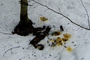 - Été/automne : verdâtres, parfois violacées à cause de la quantité importante de myrtilles consommée, leurs formes varient de l’arquée typique à un petit amas. Elles se composent principalement de graines (fleurs et fruits) et de fragments de végétaux.