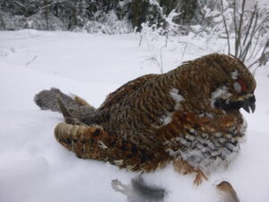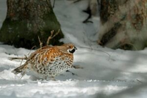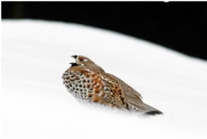 Lorsque les températures descendent très bas et que la hauteur de neige le permet, la Gélinotte se protège en se laissant ensevelir sous la neige (igloo).