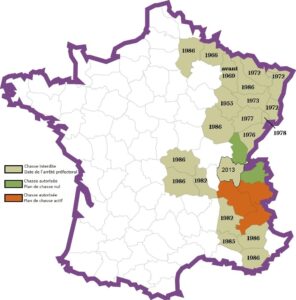 - 2 départements autorisent sa chasse mais avec un plan de chasse "nul" : Haute-Savoie et Jura.