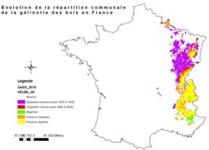 En revanche, elle a probablement disparu du massif Central où elle n'a quasiment plus été observée depuis les années 2000. Cette disparition est certainement liée aux grands épisodes de déforestation qu'on subit les massifs au cours des siècles précédents.