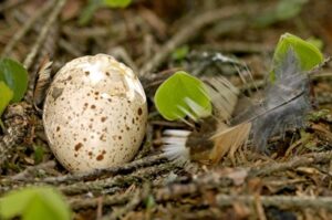 - coquille d'oeuf : la découverte de ce type d'indice est très rare mais les informations que l'on peut en tirer sont très importantes puisqu'elles constituent une preuve indiscutable de nidification. L'espèce étant nidifuge, elle ne s'occupe pas d'évacuer les coquilles du nid. Si les œufs ne sont pas mangés, ils sont découverts dans la cuvette de ponte ou à proximité immédiate. La couleur de la coquille est crème ou fauve pâle, finement pointillé ou tacheté de brun rougeâtre. Les oeufs mesurent environ 41 à 41.5 mm de long et 21 à 28 mm de large.