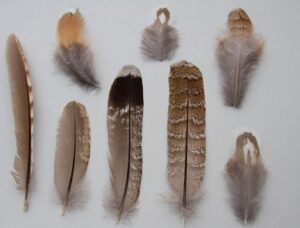 - plumes : Après les crottes/fientes, les plumes sont les indices que l'on découvre le plus fréquemment. Il n'y a pas de lieu préférentiel pour trouver des plumes. Elles se trouvent généralement avec d'autres indices. Cependant, il arrive parfois qu'une plume isolée soit découverte dans un secteur où aucun autre indice ne soit observé. Comme chez les autres espèces de tétraoninés, une plumule de duvet supplémentaire est développée à la base des tectrices : l'hyporachis.