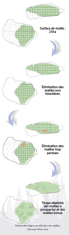 Le protocole s’applique sur 5 ans et couvre l’ensemble du territoire forestier du massif jurassien entre 800 m d’altitude et la limite de la végétation. Ces paramètres ne sont pas choisis au hasard mais prennent en considération la biologie et l’écologie de l’espèce. Le plan d’échantillonnage choisi s’appuie sur le principe du maillage. Il faut alors imaginer une grille composée de carrés (appelés « mailles ») recouvrant le territoire d’étude. Ces mailles de 25ha passent par un premier tri pour prendre en compte uniquement celles recouvertes à 90% ou plus de forêt (l’oiseau étant sylvicole). Par sécurité et pour faciliter les prospections, les mailles avec une pente moyenne supérieure à 20° sont elles aussi retirées de la grille initiale. Pour que le protocole soit réalisable, seulement 3 % des mailles sont tirées aléatoirement chaque année, pour un objectif de 15 % de mailles prospectées à la fin du projet. Des mailles bonus (3% d’autres mailles) sont ajoutées chaque année si le quota initialement prévu est atteint. Ainsi, 15 à 30% seront prospectés au cours des 5 ans.